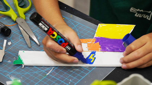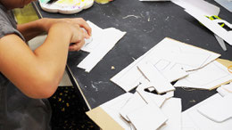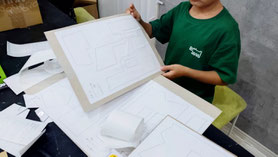 図面を台紙に貼り。それをカッターやハサミでカット。最後は色を塗ったり、そのままにしたり、自由に仕上げました。