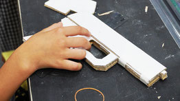8月の後半も夏休みのためレッスン時間を少し増やし、ダンボールやコートボール紙を使って輪ゴム鉄砲作りを行いました。