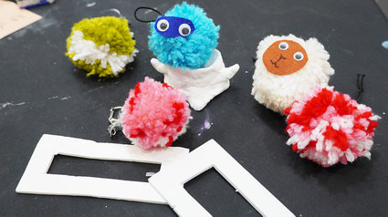 組み合わせる毛糸によって色合いを変えることができ、フェルトを使って顔を付けてぬいぐるみのようにもでき、キーホルダーを付けてランドセルにも付けることもできるので、アイディアが膨らむ創作物となっています。