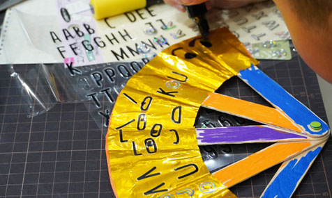 骨となる木製の棒に穴をあけ、割ピンで留め、扇面の用紙も自分達でカットして制作しました。